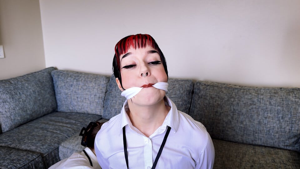 VIREX is Vigilant Reconnaissance & Extraction Elite, an intelligence unit specializing in high-risk surveillance, containment, and retrieval. One of their top agents, Rachel Adams, tests the effects of gags which agents might encounter and/or utilize; her subject is newbie agent Ditria Rose. Rachel rope-binds mini-skirted Ditria’s wrists and ankles to a metal chair, then puts a classic white cloth gag in her mouth. Ditria handles this well. Next Rachel uses a tomato-red ball gag, which Ditria also aces, even attempting to talk through it a little. The third one is a bigger, more ambitious ballgag–blood red, too–and though it opens Ditria’s mouth to the max, she doesn’t drool, which shows promising resistance under pressure. For the final test, cloth is stuffed in Ditria’s mouth and the lower half of her face is bound in a black velcro style bandage. But this too Ditria finesses, mumbling indecipherably perhaps under the gag but keeping up her good humor and resilience throughout.