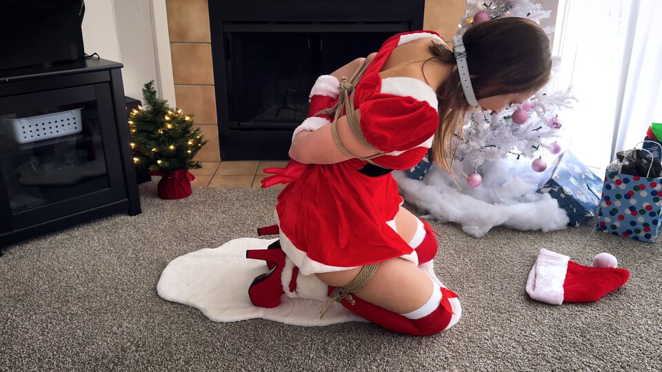 Christmas morning, the sunlight is bright through the curtains, the glittery tree is pretty, and Rachel Adams in Santa garb is in a predicament! Her cute holiday ensemble is classic: hat, dress, gloves, fur-trimmed boots; but her additional gear is not from Charles Dickens! Box-tied ropes keep her arms behind her and further down her ankles are snugly bound. We glimpse her holiday panties too. Rachel wiggles, moving about even on her knees in red stockings with bows, but finally her struggling gets her on her tummy on the carpet, where in the blink of an eye things get considerably tighter as she’s then in full hogtie and frogtie mode, with ropes firmly against her thighs and intricate rows of rope fiercely binding her torso to her legs. Rachel writhes valiantly but we can tell from her pleading expression over the white ball gag that she’s a mite frustrated she can’t pull a Houdini! So will she miss the family brunch at noontime??